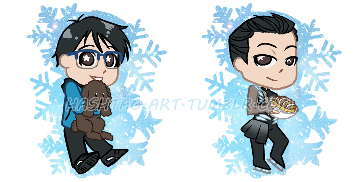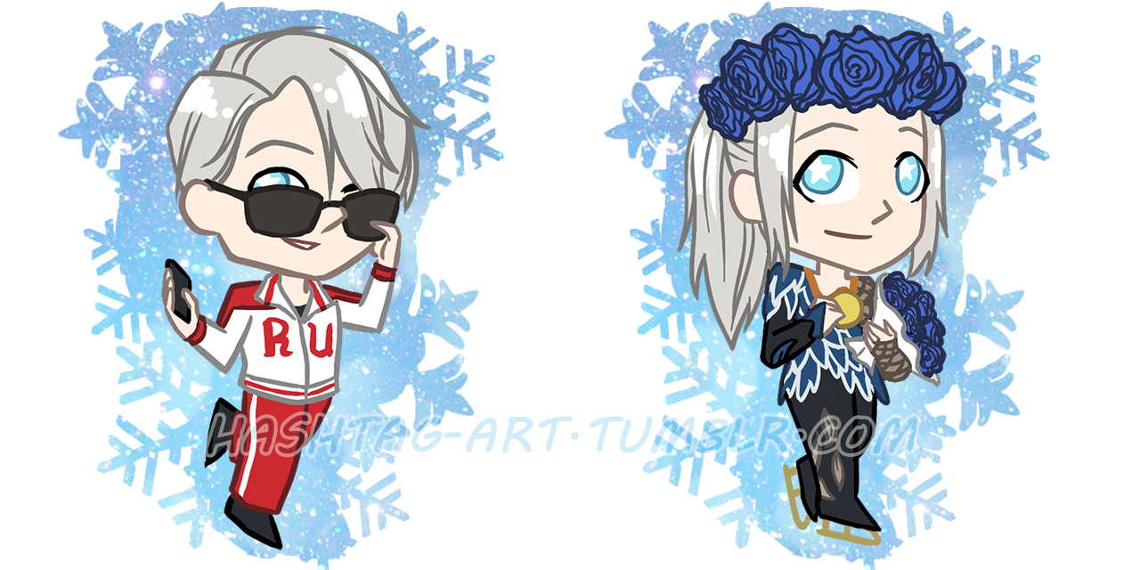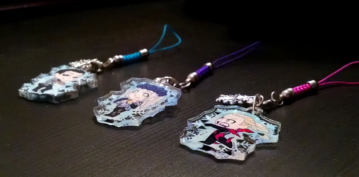 Double-sided charms of everyone's favorite figure skaters. One side is an everyday look, the other is one of their skating costumes.