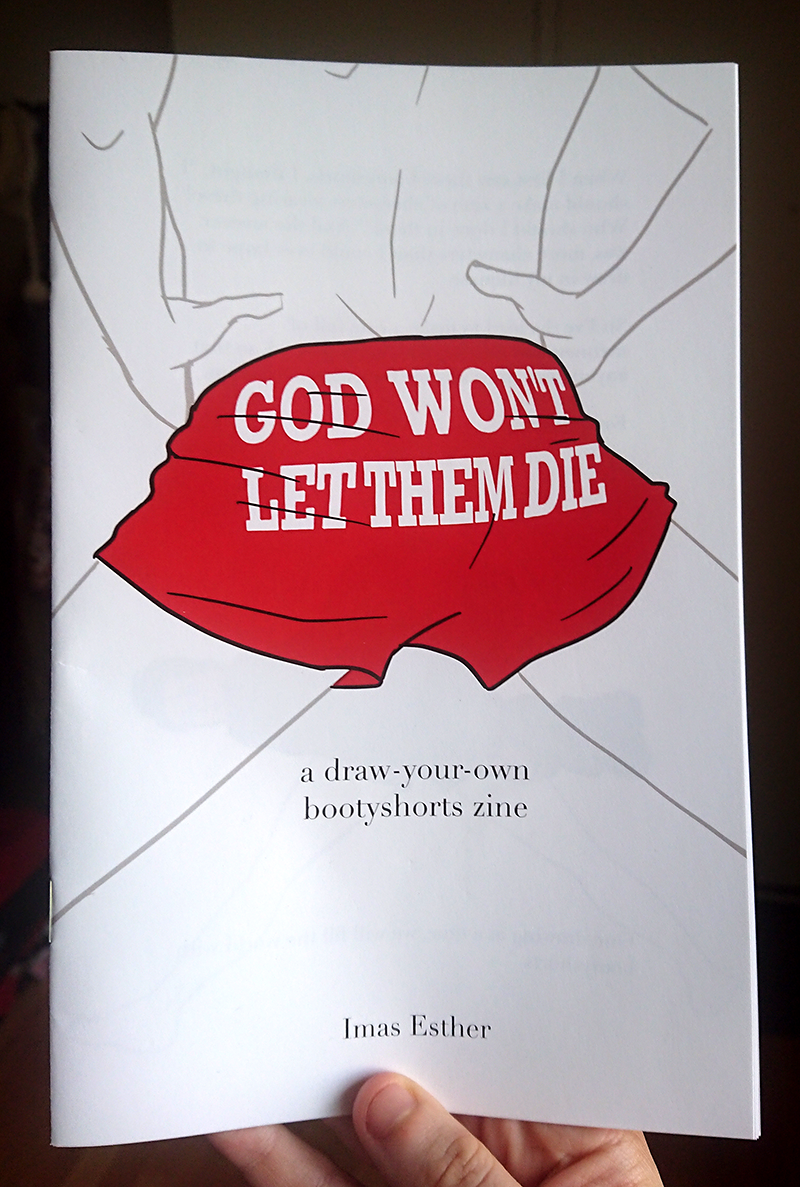 A draw-your-own-adventure zine full of template humans wearing "god won't let them die" bootyshorts so that you can draw whoever your heart desires wearing them.