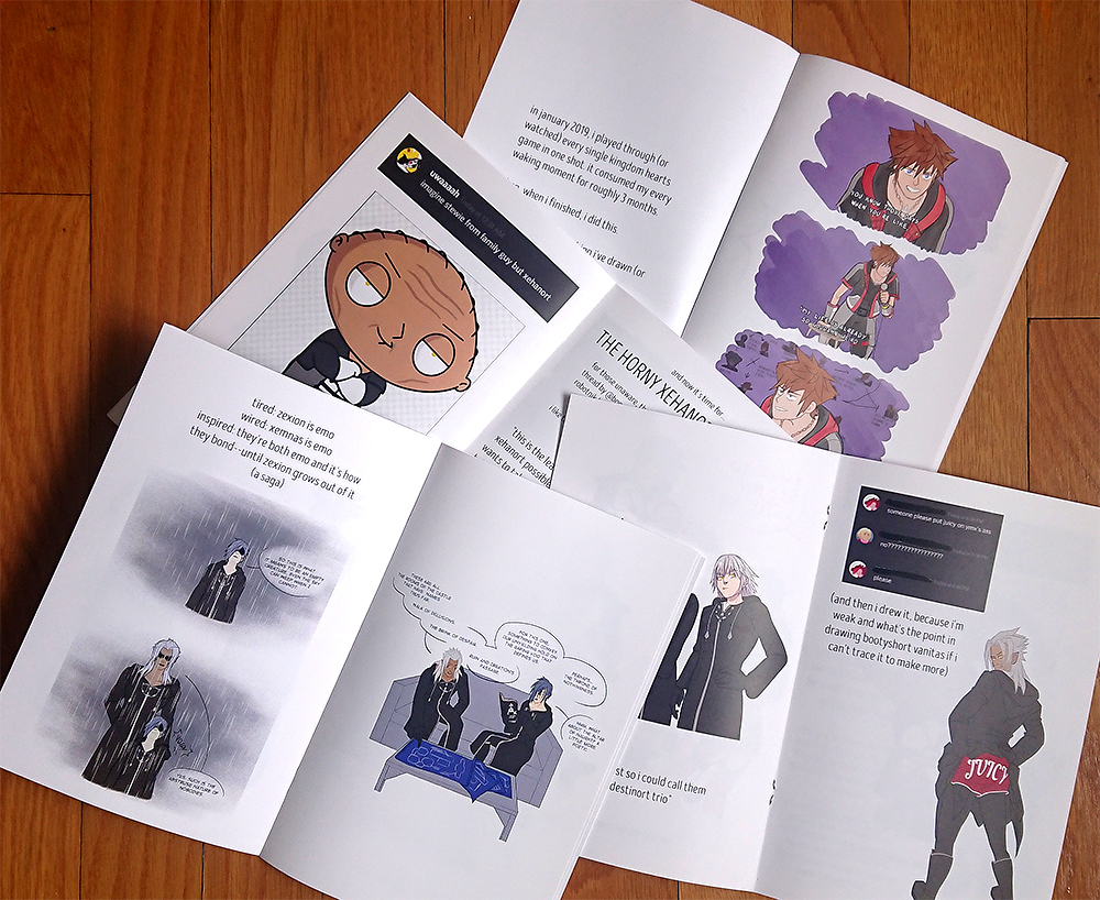 20 pages, 5.5"x8.5", full color. Compiles a collection of comics, doodles, terrible jokes, and a truly cursed ranking of all the Xehanorts.